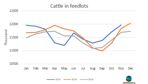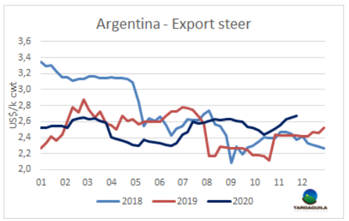盡管歐洲需求下降,中國市場不順暢,近一個(gè)月用于出口的活牛價(jià)格仍然強(qiáng)勢上漲。近五周閹牛價(jià)格上漲了13%。一些分析人士觀察到,原因之一可能是通常在年底之前出于稅收便利的原因,飼育場往往將銷售推遲到第二年。另一方面是飼育場供應(yīng)問題。許多飼養(yǎng)場把育肥到一半的牛送回,以便將育肥階段拉長,以獲得更好的價(jià)格;目前的價(jià)格增長還不夠,育肥的損失仍然很大,所以他們試圖將銷售延后到圣誕節(jié)前后。