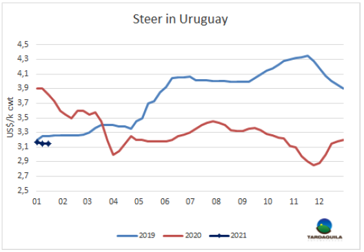 根據(jù)烏拉圭肉協(xié)提供的信息,12月閹牛的平均價(jià)值為1118美元/頭,而肉類加工業(yè)對(duì)閹牛的采購(gòu)價(jià)格下降到819美元。2020年最后4個(gè)月閹牛的價(jià)格保持在1100美元/頭左右,而9月-12月之間,每頭牛的采購(gòu)價(jià)格下降了100多美元。因此,兩者之間的差額,也就是INAC所稱的工業(yè)增加值(行業(yè)必須彌補(bǔ)成本,并最終保持利潤(rùn)),增加到每頭牛299美元,達(dá)閹牛價(jià)值的26.7%。無(wú)論從絕對(duì)數(shù)字還是相對(duì)數(shù)字來(lái)看,都是自去年四月以來(lái)的最高水平。INAC解釋說(shuō),閹牛價(jià)格每月的增長(zhǎng)是由“出口部位肉、鮮皮、內(nèi)臟和副產(chǎn)品的價(jià)格增長(zhǎng)”帶來(lái)的。“被國(guó)內(nèi)市場(chǎng)銷售價(jià)格的下降所部分抵消。2020年,工業(yè)增加值占閹牛價(jià)值的20%,高于2019年的17%,但低于2017年和2018年的27%和22%。從趨勢(shì)上看,當(dāng)工業(yè)增加值占閹牛價(jià)值的20%-25%時(shí),閹牛價(jià)值相對(duì)平衡,低于20%時(shí)價(jià)值下降,高于25%價(jià)值增長(zhǎng)。