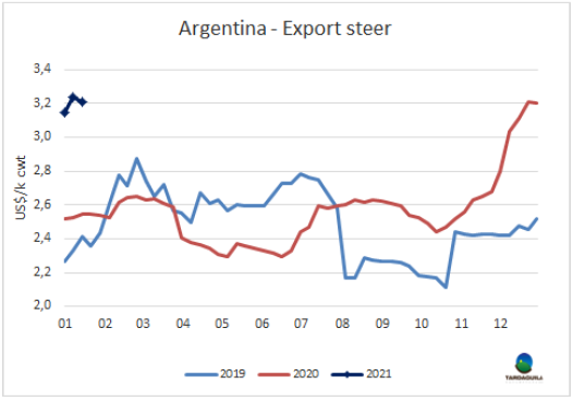 阿根廷政府在2020年最后一天宣布的為期兩個(gè)月的玉米出口禁令后取消了這一決策,改為限制每日3萬(wàn)噸的出口配額,之后政府也取消了這一限制措施。然而,對(duì)于出口的擔(dān)憂仍然存在。今年是選舉年,政府將特別關(guān)注牛肉價(jià)格,在當(dāng)前通貨膨脹的背景下,牛肉價(jià)格嚴(yán)重影響消費(fèi)者價(jià)格指數(shù)在阿根廷人的文化中根深蒂固。與政府關(guān)系非常密切的經(jīng)濟(jì)學(xué)家們認(rèn)為,必須通過(guò)加征出口稅將國(guó)內(nèi)價(jià)格與國(guó)外價(jià)格脫鉤,以至于與總統(tǒng)關(guān)系密切的副總統(tǒng)Fernanda Raverta稱阿根廷存在“出口食品的詛咒”。
