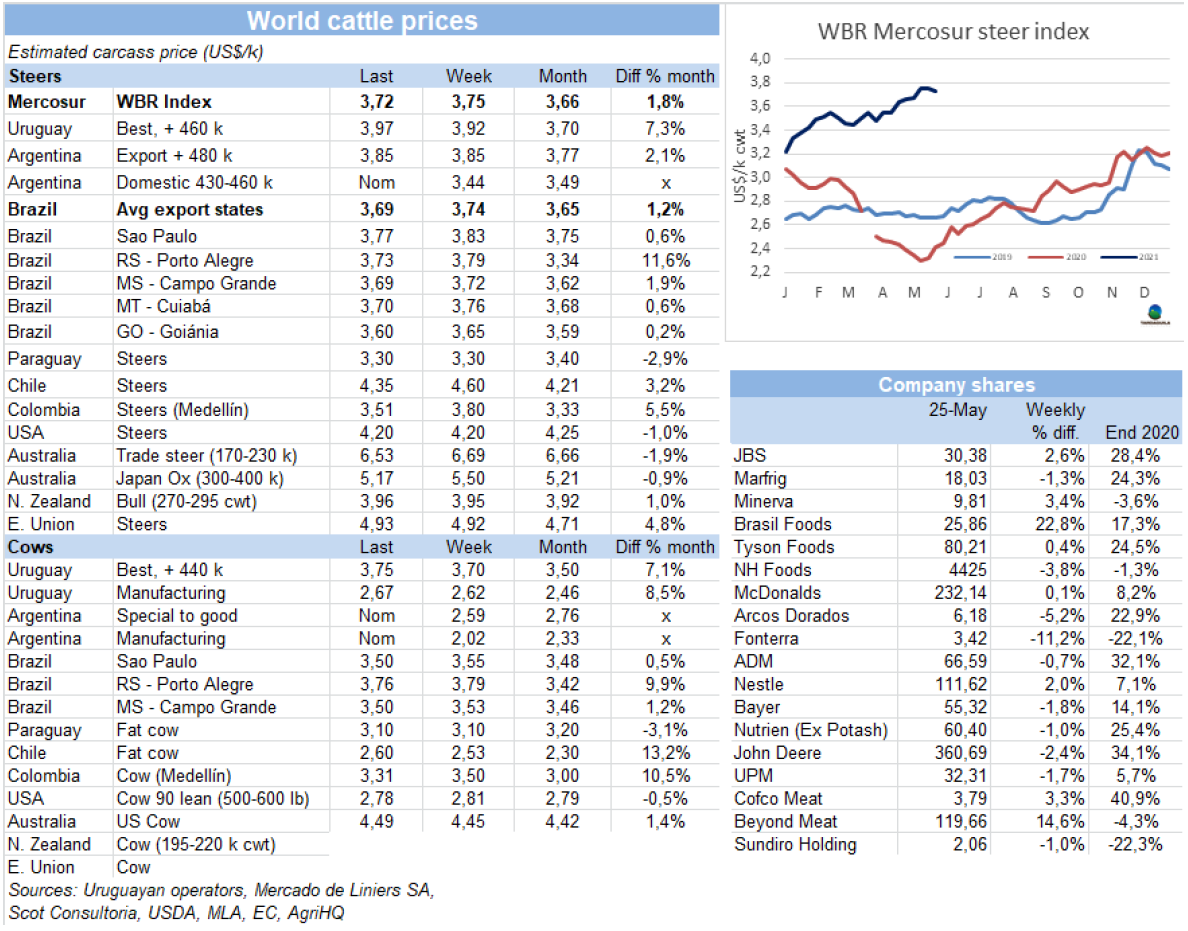巴拉圭出口商期望智利宣布的重新開放活動能夠重新激活進口市場。目前進口商20部位全牛采購價不超過5400美元/噸,距出口商對新合同的報價低400美元/噸。