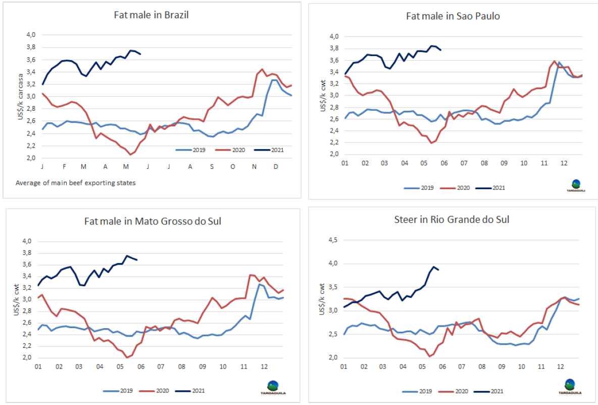 自2018年七月起,巴西牛肉月出口量連續(xù)34個月超過10萬噸。在此之前,月出口量超過10萬噸連續(xù)最長的階段是自2006年5月至2007年6月的連續(xù)14個月。據(jù)分析,這是強勁的國際市場需求所導致的,尤其是來自中國的需求。巴西的產(chǎn)能無法跟上日益增長的需求,帶來的結果則是待宰牛、架子牛和國內(nèi)市場牛肉價格的持續(xù)上漲。2018年7月育肥牛平均價格209雷亞爾/15公斤,2018年年末育肥牛價格上漲至219雷亞爾/15公斤。2019年年初育肥牛參考價220雷亞爾/15公斤,2020年育肥牛價格達300雷亞爾/15公斤。2021年前5個月育肥牛價格達310雷亞爾/15公斤,今年年底到期的期貨合約價格將達約330雷亞爾/15公斤。