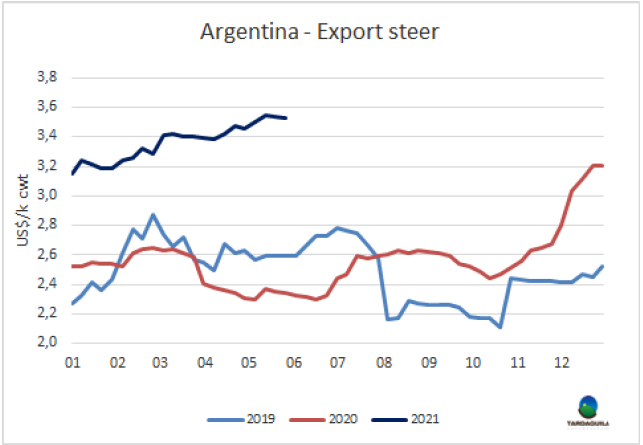阿根廷政府為控制國內(nèi)肉類價格的上漲實行了30天的出口禁令,該禁令排除對該國有關稅配額的出口活動,如希爾頓配額,481配額,美國配額和哥倫比亞配額。對以色列冰鮮產(chǎn)品的出口是否可以排除在外還不能確定。希爾頓配額和481配額代表著絕大多數(shù)牛肉對歐盟的出口量。2021年前四個月,阿根廷對歐洲冰鮮牛肉出口量達10187噸,出口額達9010萬美元,481配額出口量1540噸。同一時期阿根廷對美國出口量4427噸,占配額總量的22.7%,出口額2660萬美元。哥倫比亞的配額目前關聯(lián)不大。因此,被排除的出口量占總出口量的7.4%,由于這些產(chǎn)品的成交價格很高,按美元計的占比可能更高。除中國市場外,受出口暫停政策影響的市場主要是以色列、智利和巴西。除這些市場之外,目前正在進行的發(fā)貨包括上周一(正式知道禁令的那一天)之前簽訂的所有銷售訂單,以及在聲明和該措施生效(周四公布第75號決議)之間登記的銷售訂單。在此期間,許多出口商仍在繼續(xù)進行牛肉出口。