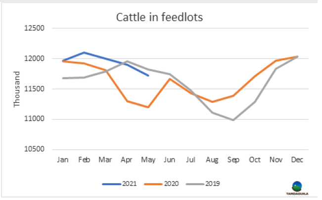上周牛屠宰量再次增長,烏拉圭肉協(xié)報告統(tǒng)計,上周屠宰量55712頭,較前一周增長了2000多頭,達今年周屠宰量的第二高。較去年同期增長了超過10000頭。隨著歐洲481配額的生產(chǎn)全面打開,閹牛屠宰量達29938頭,達2018年3月第三周至今三年多以來最大,同樣,小母牛屠宰量達6263頭,達3月第一周以來最大。相反,母牛屠宰量下降至18598頭,較上周下降了2432頭。屠宰量最大的工廠是Athena-Pulsa(4956頭),Las piedras(4532頭),Athena-Canelones(4476頭)。本周Athena三家工廠屠宰總量13639頭,Marfrig四家工廠屠宰總量13772頭,日資企業(yè)BPU上周五進行了最后一次屠宰活動,本周暫未開始屠宰,還在等待中國市場的重新準入。截止5月22日,牛屠宰量達160548頭,較2020年同期增加了15575頭,約增長了20%。如果不出現(xiàn)疫情相關的重大問題,五月屠宰量將超過22萬頭,達10年以來最高。 5月也將成為連續(xù)第八個屠宰量高于去年同期的月份。