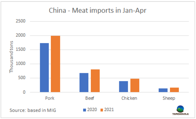據(jù)梅特國際集團發(fā)布的數(shù)據(jù),2021年前四個月中國牛肉進口量達350萬噸,較2020年同期增長了50萬噸,增長了17%。貿(mào)易的增長主要體現(xiàn)在四種主要肉類上。今年年初羊肉產(chǎn)量很低,現(xiàn)在已經(jīng)回升,比去年同期增長了28%,在四個月的時間里增加了17.4萬噸。今年4月,中國進口羊肉5.04萬噸,比2020年同月增長了37%。主要進口肉類仍是豬肉進口量達200萬噸,同比增長了15%,牛肉進口量81.5萬噸,同比增長了19%,雞肉進口量48.8萬噸,同比增長了21%。