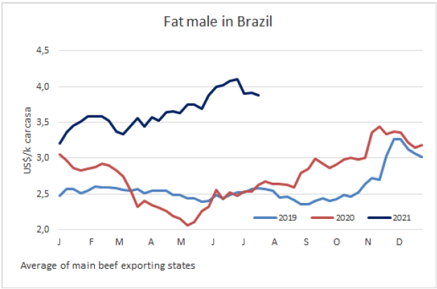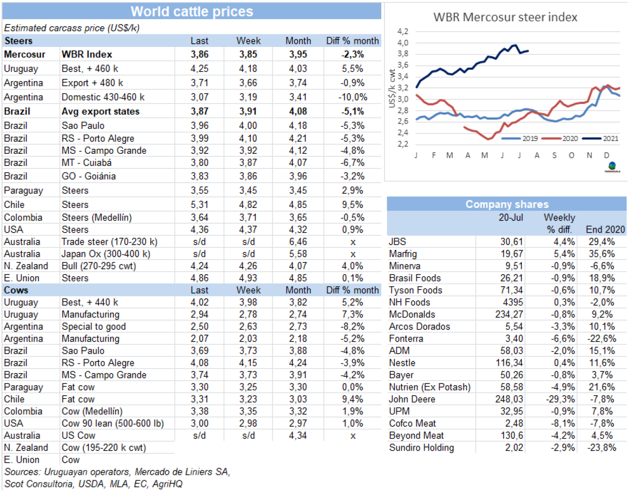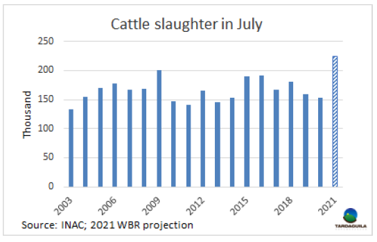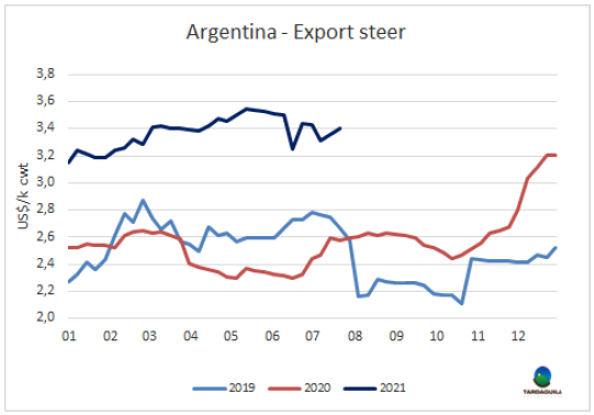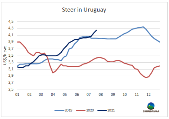 6月閹牛類型價(jià)值1261美元/頭,較上月增長(zhǎng)了65美元,達(dá)2020年1月至今17個(gè)月以來(lái)的最高。烏拉圭肉協(xié)報(bào)告稱本月閹牛類型價(jià)值增加的原因是出口部位肉價(jià)格上漲和國(guó)內(nèi)市場(chǎng)胴體價(jià)格、副產(chǎn)品和鮮皮價(jià)格上漲。活牛采購(gòu)價(jià)格上漲了37美元/頭,因此兩者的價(jià)差工業(yè)增加值增長(zhǎng)了29美元至214美元,工業(yè)增加值增長(zhǎng)了1.5%至17%,如果價(jià)值低于20%,則認(rèn)為該行業(yè)很難實(shí)現(xiàn)正利潤(rùn)。