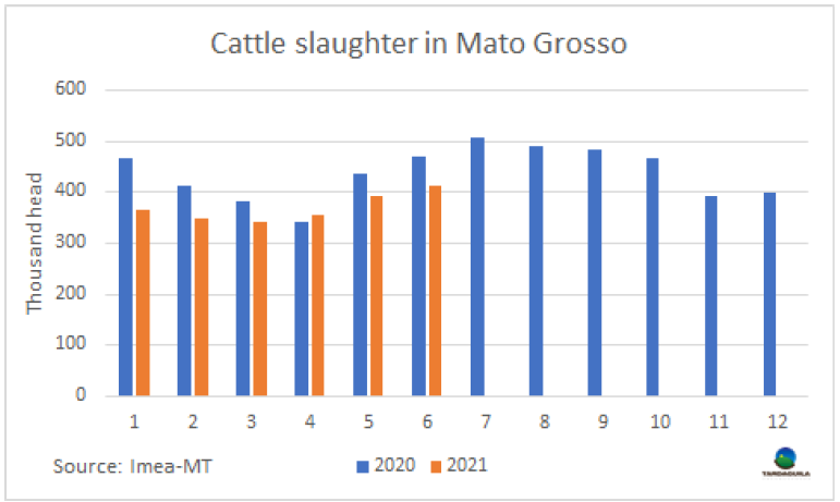 今年前半年巴西活牛存欄最大的州馬托格羅索州牛屠宰量下降了29.2萬(wàn)頭至222萬(wàn)頭,下降了11.6%。6月該州牛屠宰量41.2萬(wàn)頭,盡管較五月屠宰量增長(zhǎng)了2萬(wàn)頭,是今年最大的月度牛屠宰量,與去年同期相比仍下降了12.5%。因?yàn)榘臀鞔鏅谥亟ǔ掷m(xù),屠宰量的下降主要表現(xiàn)在母牛上,6月馬托格羅索州的母牛屠宰量16.2萬(wàn)頭,較2020年6月下降了21.2%,因此今年前半年馬托格羅索州母牛屠宰量達(dá)94.4萬(wàn)頭,同比下降了19.6%。