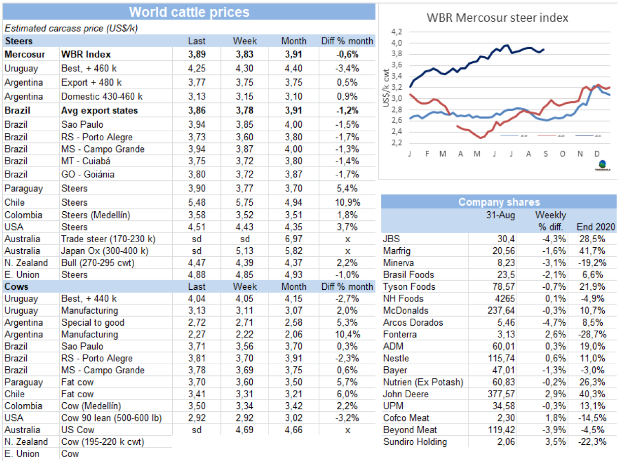 本周育肥牛價格的變形趨勢加劇,供應(yīng)有所增加,預(yù)定時間拉長至10-11天。圣保羅州牛價下行明顯,給附近地區(qū)的參考價帶來壓力。昨天圣保羅地區(qū)活牛成交價305.5雷亞爾/15公斤,30天付款不含稅。通常圣保羅是附近以及周邊地區(qū)牛家最高的地方。牛肉批發(fā)市場銷售仍然疲軟,盡管本月初有預(yù)期稱未來幾天牛肉銷售將走強,通常9月7日的獨立日消費將有增長,也將促進牛肉的消費。