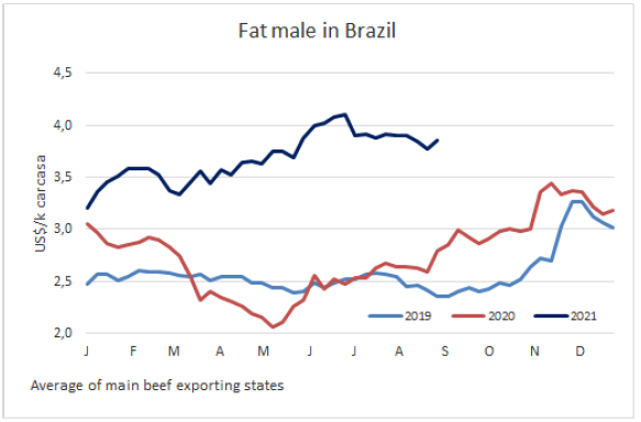 昨日,實施3個月的牛肉出口限制于當(dāng)天到期,但政府不顧過去幾周的抗議、警告,決定將該限制延長2個月。因此,除關(guān)稅配額(希爾頓和481年歐盟、美國配額)和出口至以色列的每月3500噸,限制出口量不超過去年下半年平均值的50%的政策將被延期至10月31日。目前,7月和6月的出口量較5月低45%,較去年同期低三分之一。政府證證實了限制政策延期,生產(chǎn)者發(fā)起罷工。生產(chǎn)發(fā)展部的消息人士解釋了決定繼續(xù)限制出口的原因:“牛肉出口遠(yuǎn)高于歷史平均水平。今年7月,牛肉出口額達1.94億美元,雖然這一數(shù)字較2020年7月下降了16%,但和2019年7月相比,仍高于歷史平均水平。2021年7月,巴西的牛肉出口“比2018年7月高11%,比2017年7月高71%,比2016年7月高135%,比2015年7月高172%”。同時政府聯(lián)絡(luò)委員會宣布,該政策讓生產(chǎn)商更加不安,他們可能會決定采取停產(chǎn)措施,盡管他們沒有具體說明日期或期限。