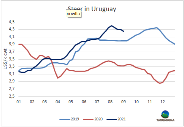 自8月初價格達歷史最高水平以來,育肥牛市場一直保持著溫和的下跌趨勢。一方面,有些人認(rèn)為供應(yīng)略有增多,另一方面,需求端非常關(guān)心是否可以找到集裝箱把已完成的產(chǎn)量運走。有工廠稱未來幾天甚至幾周由于裝運延誤可能將被迫減產(chǎn)。美麗華決定可能從下周中旬開始停止在3廠的生產(chǎn),并讓員工休假直到10月初。Marfrig還在評估暫停55廠的屠宰活動,可能在未來幾小時內(nèi)做出決定。目前的裝運除了通過蒙得維的亞港以外,也在尋求其他港口,但這并不容易,南美地區(qū)乃至世界上所有港口都有同樣的問題。有些工廠預(yù)定了3-4周后的牛,但還沒有采購;還有一些工廠預(yù)定一周之內(nèi)交貨的牛,母牛的需求量大于閹牛。特種閹牛價格大多是每公斤4.25美元,有幾頭超過了4.20美元,偶爾也有4.3美元的交易。對于母牛來說,體重較重的一般支付4.00-4.05美元,體重較低的最高可達4.10美元。人們預(yù)計,市場將繼續(xù)緩慢下滑,特別是在物流問題無法解決的情況下。育肥牛市場保持下行趨勢,或?qū)⒊掷m(xù)數(shù)周。據(jù)被問詢的市場參與者反映,大多數(shù)工廠備貨充足,期貨采購時間拉長,有些工廠甚至開始買九月前10天的牛。這種情況下工廠壓價幾美分,只要生產(chǎn)者可以接受,價格會繼續(xù)下跌。本周用于出口的特種閹牛參考價4.3美元/公斤,國內(nèi)市場的閹牛參考價4.25美元/公斤,肉母牛4.05-4.15美元/公斤,牛供應(yīng)量仍很少,預(yù)計15天之后隨著天氣變化和烏拉圭南部的降雨來臨活牛供應(yīng)將增加。