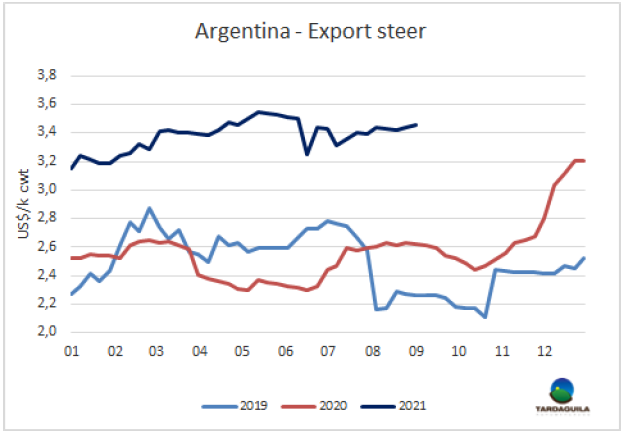 七月南美牛肉產(chǎn)品平均離岸價格5457美元/噸,達2011年11月至今十年以來最高。與去年七月相比,平均價格上漲了1285美元/噸,上漲了31%。今年前七個月南美國家牛肉出口平均價格4832美元/噸,較2020年的4492美元/噸上漲了8%。南美四國牛肉供不應(yīng)求,價格強勁上漲。其中價格上漲最明顯的是實行出口限制的阿根廷,部分原因是配額產(chǎn)品的出口占比增大,配額產(chǎn)品平均價格較高。當(dāng)然還有政府管控后“地下合同”減少的原因。四月阿根廷平均出口價格4072美元/噸,是南美地區(qū)最低,七月阿根廷平均出口價格達5389美元/噸,三個月內(nèi)增長了32%。同期內(nèi),烏拉圭牛肉價格上漲了11%,巴西牛肉價格上漲了14%,巴拉圭價格上漲了15%,烏拉圭仍然是南美牛肉價格最高的國家,七月平均價格達5891美元/噸。