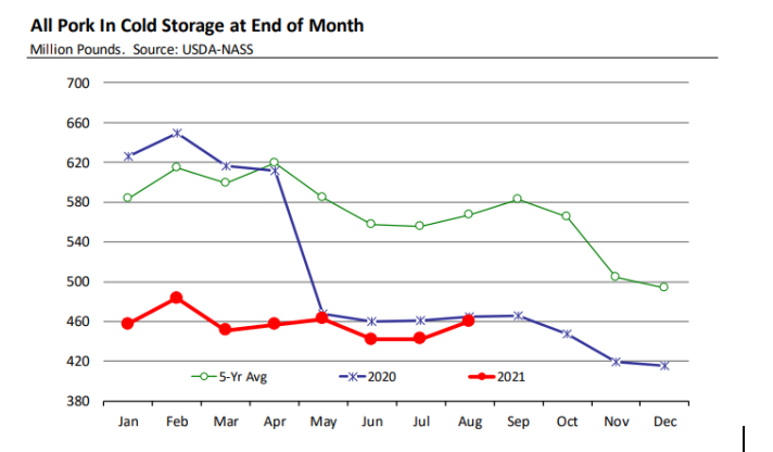 存欄方面,USDA9月1日生豬存欄數(shù)據(jù)顯示,生豬存欄7540萬頭,環(huán)比增加1%,同比減少4%。能繁母豬存欄619萬頭,同比減少2%,較6月統(tǒng)計的存欄減少0.6%。這是自2013年以來首次9月統(tǒng)計的能繁母豬存欄量低于6月統(tǒng)計的能繁母豬存欄量。預計明年春天和夏天會迎來能繁母豬存欄歷史低位。商品豬存欄6920萬頭,同比減少4%。生豬存欄量同比減少比較明顯的是體重低于120磅的,這些生豬預計在今年冬季出欄,相應的屠宰量預計同比減少6%。