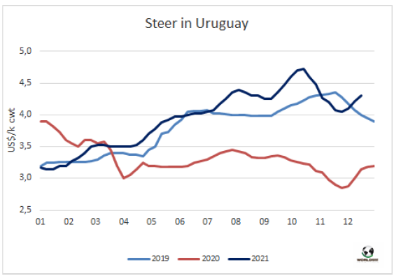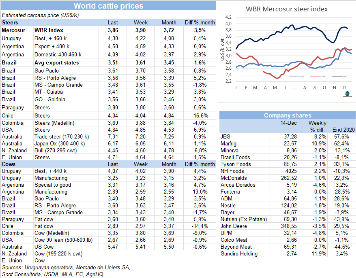本周南方共同市場閹牛價格指數在連續(xù)五周的上漲之后下跌,本周下跌了4美分至3.86美元/公斤。該指數下跌的主要原因是巴西育肥牛雷亞爾價格下滑。此外,巴西雷亞爾兌美元匯率下跌了0.9%,巴西主要出口州育肥牛價格本周下降了10美分至3.51美元/公斤,與其他地區(qū)相比,巴西的價格拉開了與其他地區(qū)牛價的差距。相反烏拉圭市場堅挺,特種重型閹牛貿易參考價4.3美元/公斤。阿根廷和巴拉圭市場保持穩(wěn)定,阿根廷出口閹牛參考價在4.58美元/公斤,巴拉圭參考價3.8美元/公斤。