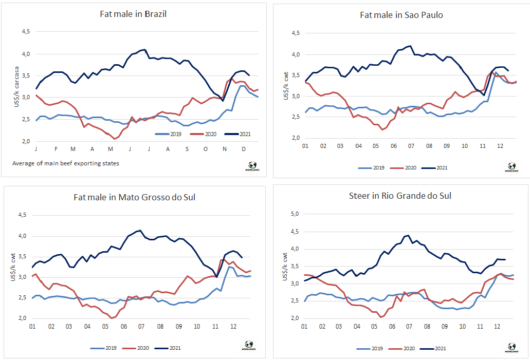 育肥牛價格本周全面下跌。主要原因是12月上半月國內市場表現不佳,和無法出口中國。唯一牛價沒有下行的地區(qū)是南里奧格蘭德州,南馬托格羅索州和馬托格羅索州牛價有持續(xù)下跌,育肥牛價格較上周下跌了7-8雷亞爾/15公斤分別下跌至297.5雷亞爾/15公斤和291.5雷亞爾/15公斤。圣保羅州牛價下跌了4.5雷亞爾/15公斤,至308.5雷亞爾/15公斤。圣保羅州預定時間在8天左右,工廠的采購價格仍保持下行壓力。包裝工廠和分銷商的牛肉庫存都很大。