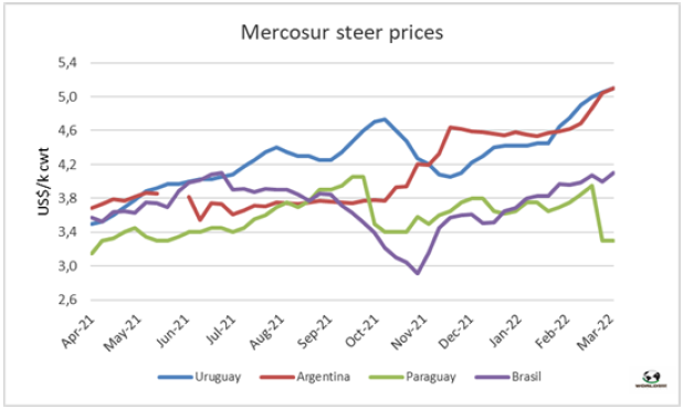 本周南方共同市場閹牛價(jià)格指數(shù)繼續(xù)8美分至4.36美元/公斤,創(chuàng)新紀(jì)錄。巴西烏拉圭阿根廷牛價(jià)均上漲,巴西育肥牛平均價(jià)格上漲主要原因是匯率走強(qiáng)和本地雷亞爾價(jià)格同步上漲,美金牛價(jià)較上周上漲了10美分至4.1美元/公斤。阿根廷和烏拉圭牛價(jià)達(dá)南美地區(qū)最高,也是歷史最高價(jià)格,本周出口閹牛參考價(jià)接近5.1美元/公斤,巴拉圭方面牛價(jià)趨勢相反,西方對(duì)俄羅斯的制裁限制了向這個(gè)國家銷售的可能性,巴拉圭受到了強(qiáng)烈的沖擊。