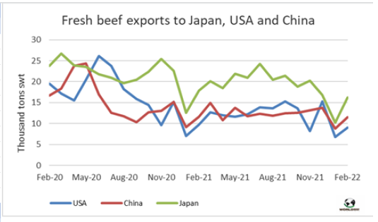 澳大利亞Beefcentral表示,2月澳大利亞牛肉出口總量僅為59513噸,比去年同期已經(jīng)很低的66818噸下降了11%,比2017-21年2月份五年平均水平低28%。上個(gè)月,日本進(jìn)口的澳大利亞牛肉為16232噸,比去年同期(17878噸)減少了近10%,而中國進(jìn)口的澳大利亞牛肉為11531噸,較1月8780噸的低谷大幅增加,僅略低于去年2月(11676噸)。