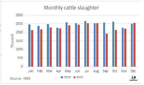 根據(jù)巴西地理和統(tǒng)計(jì)研究所(IBGE)的數(shù)據(jù),巴西活牛生產(chǎn)商2021年屠宰了2754萬頭牛,比前一年下降了7.8%。IBGE在一份報(bào)告中表示:“這一結(jié)果反映出牛屠宰量連續(xù)第二年下降,延續(xù)了自2020年初以來觀察到的保留存欄情況?!迸c去年同期相比,唯一一個(gè)屠宰量增加的月份是12月,增加了4萬頭,而降幅最大的是9月,減少了65.1萬頭,由于馬托格羅索州和米納斯吉拉斯州出現(xiàn)了非典型的瘋牛病病例,出口禁運(yùn)。犢牛平均價(jià)格創(chuàng)紀(jì)錄的上漲刺激了母牛的保留存欄。2021年全年母牛屠宰的量931萬頭,是自2004年以來的最低記錄。” 今的年牛屠宰數(shù)量較2020年減少了234萬頭,27個(gè)州中23個(gè)州屠宰量都有減少。馬托格羅索州屠宰量下降最為顯著,下降了633.91萬頭。南馬托格羅索州屠宰量減少了43.89萬頭。2021年馬托格羅索州仍以16.2%的占比保持屠宰量領(lǐng)先地位,其次是戈亞斯州(占比10.8%)和南馬托格羅索州(占比10.7%)。2021年第四季度,衛(wèi)生檢查機(jī)構(gòu)注冊(cè)下的屠宰廠屠宰量約690萬頭,較2020年第四季度下降了6.4%,達(dá)2008年以來最低。與2021年第三季度相比,屠宰量下降了0.9%。