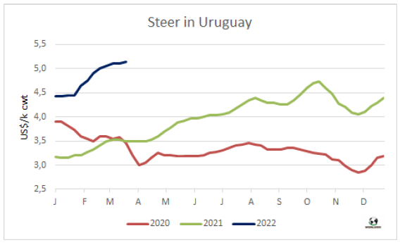 由于貨幣匯率走強(qiáng),南美地區(qū)美元牛價(jià)急劇上漲,主要是雷亞爾價(jià)格上漲。巴西貨幣本周升值近5%,帶動(dòng)新興國家一籃子貨幣的復(fù)蘇。利率上升,加上巴西出口牛肉價(jià)格的上漲,推高了巴西牛價(jià)。盡管育肥牛雷亞爾價(jià)格有所下降,主要出口州牛價(jià)上漲了18美分至4.22美元/公斤。南美其他三國的牛價(jià)也有小幅上漲,本周烏拉圭特種閹牛價(jià)格上漲了5美分至5.15美元/公斤,阿根廷英國串種閹牛上漲了1美分至5.13美元/公斤。巴拉圭待宰牛價(jià)格也有上漲,因?yàn)槿藗冾A(yù)期盡管西方制裁給對(duì)俄羅斯的出口業(yè)務(wù)增加了難度,巴拉圭還可以向俄羅斯出口一些牛。本周待宰牛價(jià)格上漲了10美分至3.40美元/公斤。