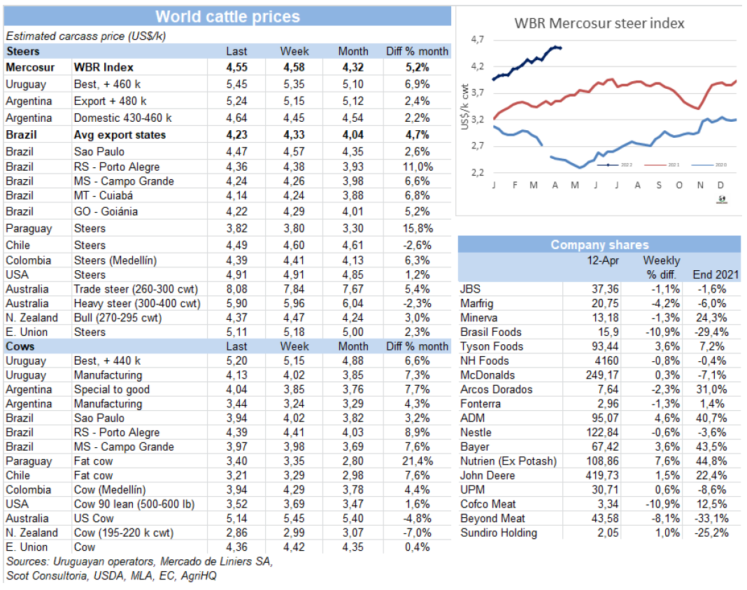 牛屠宰量連續(xù)三周縮減,但周屠宰量仍保持五萬頭以上。烏拉圭肉協(xié)統(tǒng)計截止4月9日當(dāng)周牛屠宰量52068頭,較上周減少了1479頭,較三周前屠宰量最高點下降了6000頭,較去年同期屠宰量下降了28%。本周屠宰量下降主要由于閹牛和小母牛屠宰量分別較上周下降了11%-12%,母牛屠宰量較上周增長了12%。屠宰活動最活躍的工廠是Marfrig Tacuarembo(7廠), 屠宰量5103頭。Las Piedras(379廠),屠宰量4895頭,Marfrig-Colonia (2廠),屠宰量3978頭。Marfrig四家屠宰廠屠宰量15653頭,較上周略有上漲,美麗華三家屠宰場屠宰量9838頭。