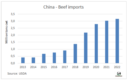 三月主要出口國對中國市場牛肉出口量超20萬噸,僅在去年八月和九月出口量超過該數(shù)量。巴西的發(fā)運量強勁是主要原因,從烏拉圭、澳洲的發(fā)運量也很大。2022年第一季度,向中國出口牛肉的全球主要牛肉供應(yīng)國出貨量約為21.2萬噸,僅低于2021年9月的紀(jì)錄。出口量同比增長16%(約7.6萬噸)。