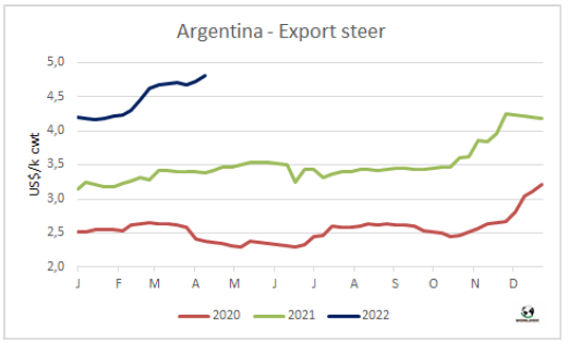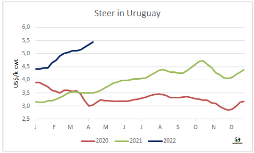 供應(yīng)短缺和價格普遍上漲繼續(xù)推高出口閹牛價格。上周牛價上漲了10-15比索,自今年年初以來,累計上漲了90-110比索。英國純種閹牛參考價530-545比索之間,比今年年初上漲了25%,而瘤牛雜交品種的價格上漲到490-510比索/公斤,今年迄今為止上漲了21%。特優(yōu)母牛供應(yīng)稀缺,上周價格上漲了20比索至460-480比索/公斤,與3個月前相比累計上漲了31%。主要賣到中國市場的工業(yè)母?,F(xiàn)在的價格約為420-430比索/公斤,比2022年初上漲了27%。