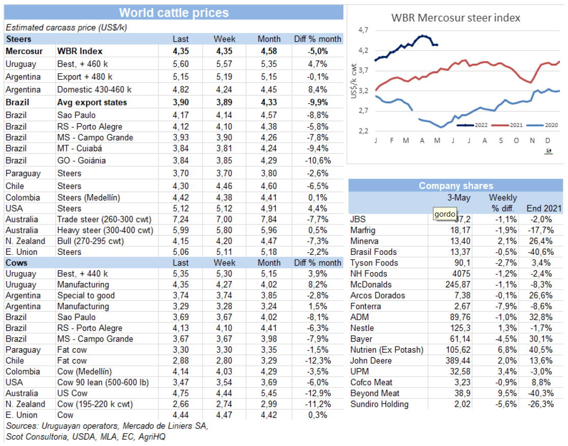 巴西育肥牛價(jià)格連續(xù)七周下跌后,市場達(dá)到了新的平衡。最近一周價(jià)格僅下跌了1雷亞爾/15公斤,主要出口州育肥牛價(jià)格參考價(jià)291雷亞爾/15公斤。需求方面,在周末母親節(jié)的額外需求的加持下,圣保羅批發(fā)市場銷售情況不錯(cuò)。草飼牛的供應(yīng)增長,給市場帶來了一些壓力,預(yù)計(jì)五月前兩周市場將保持穩(wěn)定。