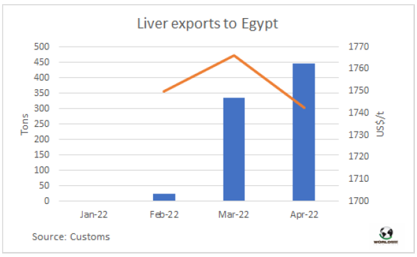 由于西方對(duì)俄羅斯的制裁,對(duì)俄出口貿(mào)易困難,促進(jìn)了烏拉圭牛肝對(duì)埃及的出口。三月烏拉圭對(duì)埃及牛肝出口量336噸,四月對(duì)埃及牛肝出口量445噸,出口平均價(jià)格在1750美元/噸波動(dòng)。同時(shí)對(duì)俄羅斯銷售仍處在低水平,1月和2月對(duì)俄羅斯銷售超過400噸,3-4月貿(mào)易量下降至28噸,平均價(jià)格與埃及市場價(jià)格差不多。