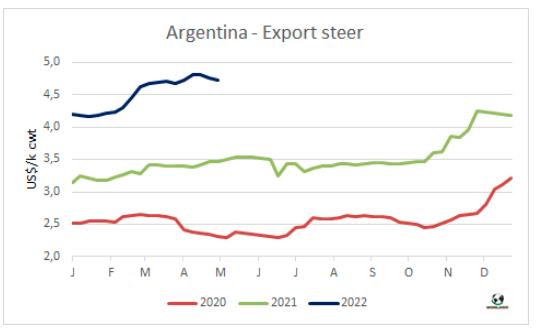 阿根廷牛肉出口協(xié)會(huì)昨日宣布,由于一些國際市場價(jià)格下跌,他們將不得不“重新分析海外銷售業(yè)務(wù),調(diào)整成本結(jié)構(gòu)”,以適應(yīng)新的出口形勢。他們說,希爾頓配額的價(jià)格從17900-18000美元/噸下降到現(xiàn)在的15000美元/噸。481配額產(chǎn)品價(jià)格從11000美元/噸下降至目前的9000美元/噸。由于新冠肺炎疫情、人民幣貶值、上海港口堵塞等原因,中國市場價(jià)格每噸下降了1000美元。