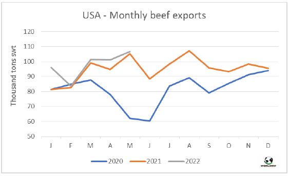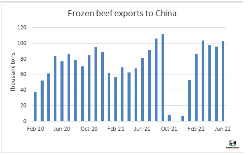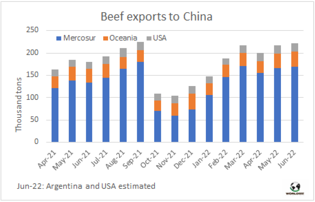 6月份,中國牛肉的主要供應國發(fā)船量仍然很大。據(jù)估計,南方共同市場、澳洲和美國牛肉出口量達22.1萬噸,非常接近2021年9月22.4萬噸的最高峰值。據(jù)估計從南方共同市場發(fā)貨量約17萬噸,其中從巴西發(fā)貨量超過10.3萬噸。此外,從澳洲發(fā)貨量3.3萬噸,從美國發(fā)貨量1.8萬噸,與3-5月的出貨水平相當。這些貨物量大多在7月下半月到8月之間抵達中國。