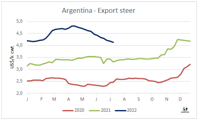 周二,受俄羅斯石油對歐盟國家斷供影響,歐元兌美元匯率跌至20年以來最低水平。投資者更青睞美元,自今年年初以來美元已經(jīng)上漲了近14%。阿根廷希爾頓臀腰肉價格受此影響下跌,過去一周內(nèi)下跌了500美元/噸。據(jù)市場參與者反映,13000美元/噸已經(jīng)是成交價的天花板了。有一位歐洲進口商還價13000-13500美元/噸,本周初其他進口商給新發(fā)船的阿根廷產(chǎn)品還價在12700-12800美元/噸。烏拉圭方面,受屠宰量急劇縮減的影響,供應有限,參考價12500美元/噸。