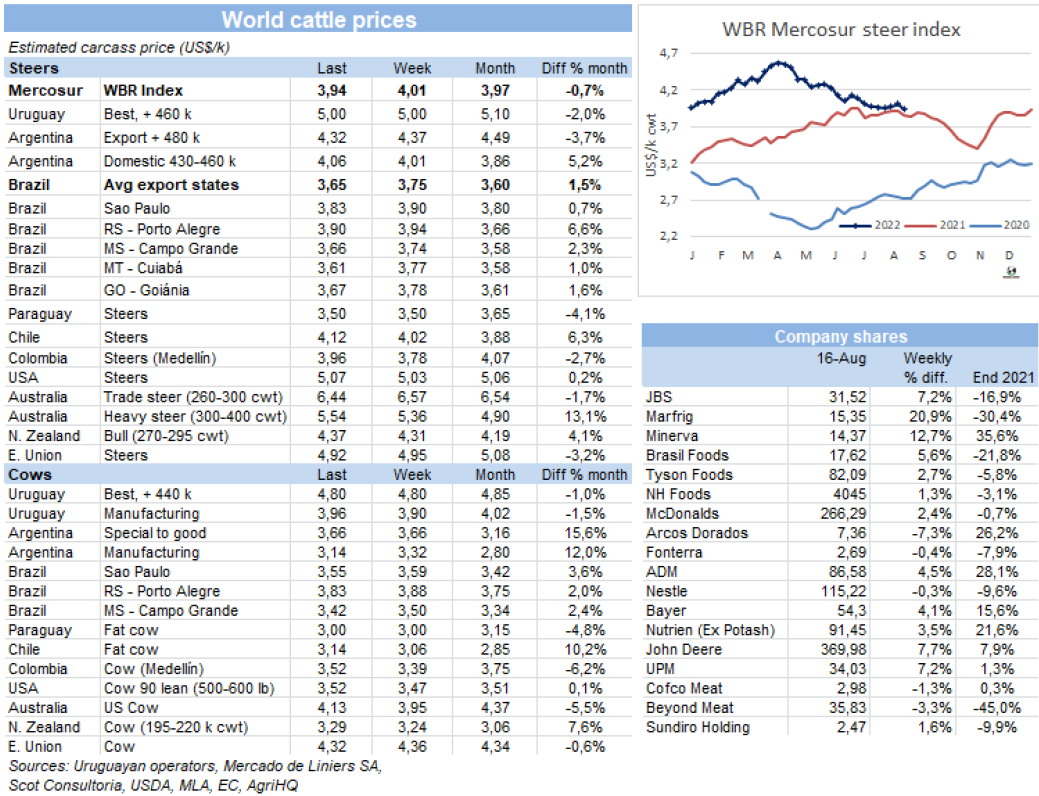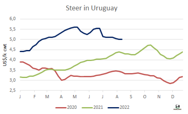 七月閹牛類(lèi)型值連續(xù)兩周下跌,烏拉圭肉協(xié)報(bào)告每頭牛的閹牛類(lèi)型值較上月下降了53美元,較五月的峰值下降了85美元。閹牛類(lèi)型價(jià)值是烏拉圭肉協(xié)對(duì)一頭520公斤重,出成率54%的閹牛及其串種屠宰后產(chǎn)生所有產(chǎn)品的銷(xiāo)售價(jià)格的預(yù)估。烏拉圭肉協(xié)稱(chēng)閹牛類(lèi)型值下降是由于其組成成分的價(jià)格,其中下跌最明顯的是牛雜碎、牛副產(chǎn)品和鮮牛皮下跌最明顯。而屠宰場(chǎng)的活牛采購(gòu)價(jià)格較上月僅下跌了2美分至1550美元,因此工業(yè)附加值縮減了51美金/頭至235美元,因此工廠要想盈利必須覆蓋其他成本。