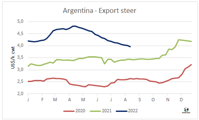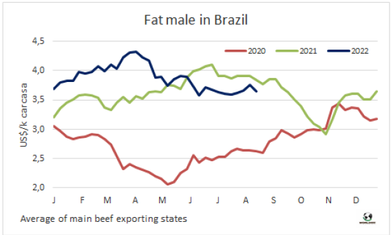 八月前十個(gè)工作日巴西出口量持續(xù)較大,出口價(jià)格下降。巴西外貿(mào)部報(bào)告前十個(gè)工作日巴西牛肉出口量達(dá)88806噸,平均出口價(jià)格6284美元/噸,平均出口價(jià)格較七月下降了4%,較六月的最高點(diǎn)下降了8%。如果保持前兩周的出口節(jié)奏,八月巴西牛肉出口量將達(dá)20萬(wàn)噸,較2021年八月增加超2萬(wàn)噸,也將創(chuàng)歷年八月出口量最高記錄。
