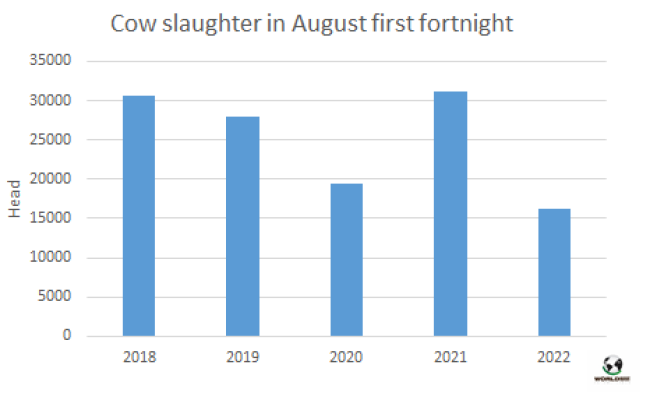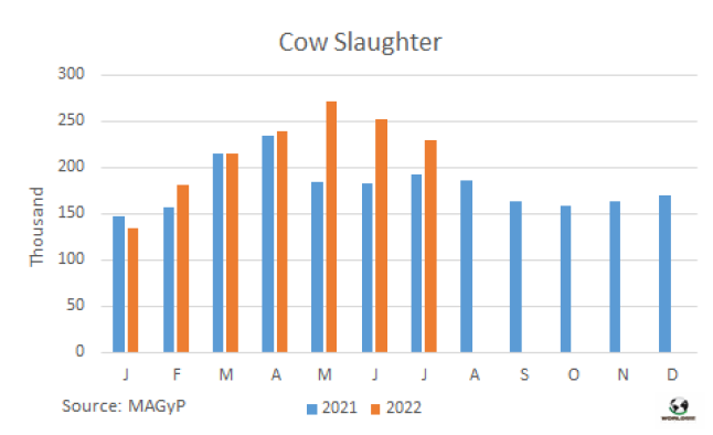 7月牛肉產(chǎn)量26.1萬(wàn)噸,同比下降1.6%。7月人均消費(fèi)量達(dá)45公斤/人/年,比一年前下降了5.4%。2022年到目前為止,由于平均屠宰重量的增加,牛肉產(chǎn)量已達(dá)180萬(wàn)噸,比2021年同期增加了近4%。因此前7個(gè)月的人均消費(fèi)量為46公斤/人/年。