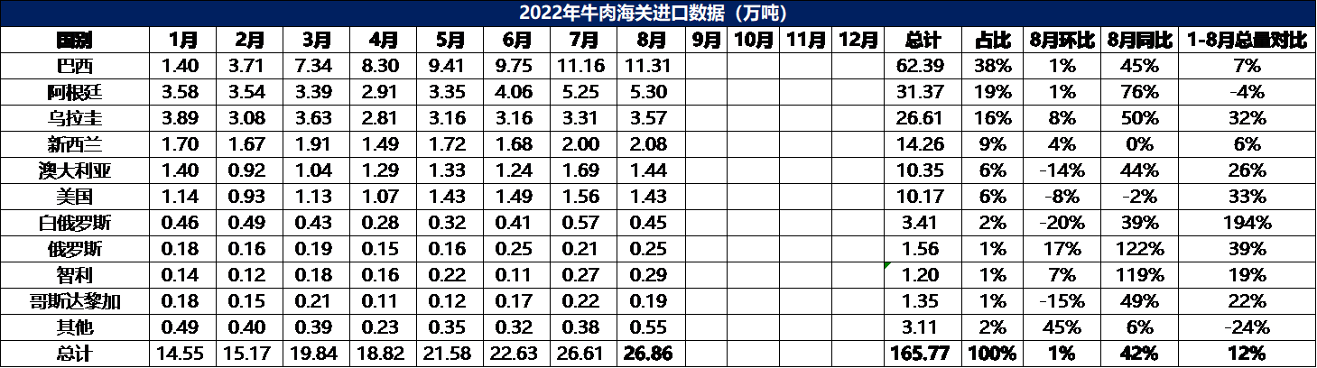 2022年1-8月冷凍牛肉進(jìn)口數(shù)據(jù)