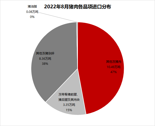從8月豬肉進(jìn)口品項(xiàng)看,其他凍豬肉和其他凍豬雜碎的進(jìn)口量之和占豬肉進(jìn)口量的85%。豬主塊肉類和豬脂肪類進(jìn)口量占比較7月變化不大。
