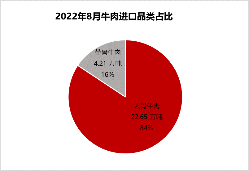 從牛肉進(jìn)口品項(xiàng)看,帶骨牛肉占比基本沒有變化。8月去骨牛肉進(jìn)口量22.65噸,占84%,帶骨牛肉進(jìn)口量4.21萬(wàn)噸,占16%。