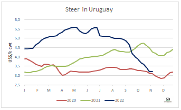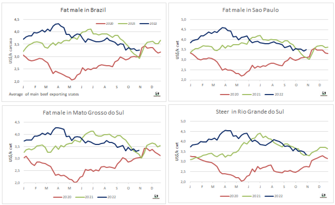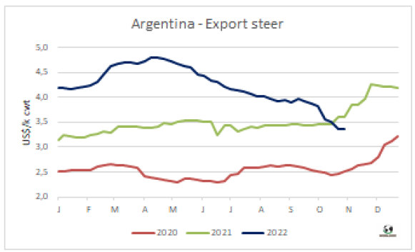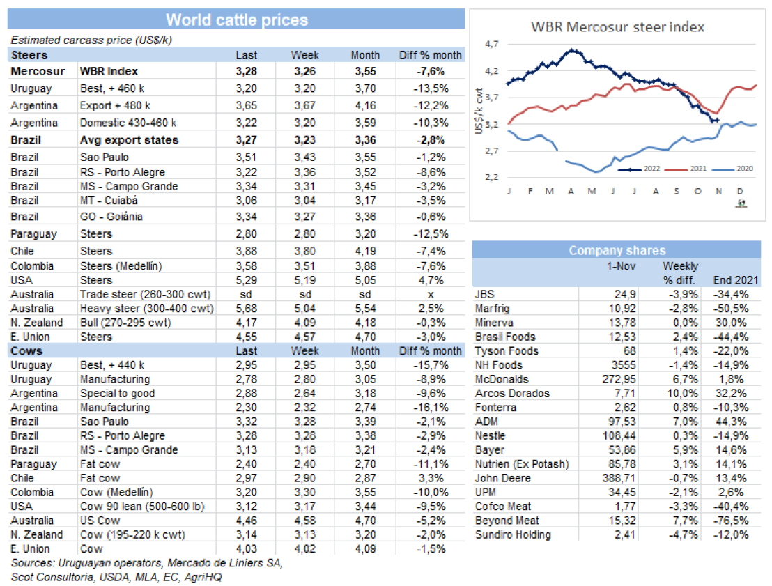 左派總統(tǒng)候選人Lula Da Silva在周日的選舉中獲勝,最初對(duì)巴西匯率產(chǎn)生了負(fù)面影響,之后雷亞爾升值,從而推高了南方共同市場(chǎng)牛價(jià)。本周南方共同市場(chǎng)閹牛價(jià)格指數(shù)上漲了2美分至3.28美元/公斤,打破了連續(xù)三周的下跌勢(shì)頭。本周巴西雷亞爾增值2.9%,中和了本地市場(chǎng)育肥牛價(jià)格的疲軟,美元價(jià)格上漲了4美分至3.27美元/公斤。阿根廷出口閹牛價(jià)格繼續(xù)下跌,本周下跌了2美分至3.65美元/公斤。烏拉圭和巴拉圭牛價(jià)保持穩(wěn)定,烏拉圭閹牛參考價(jià)3.2美元/公斤,巴拉圭參考價(jià)2.8美元/公斤。
