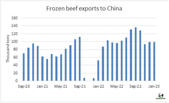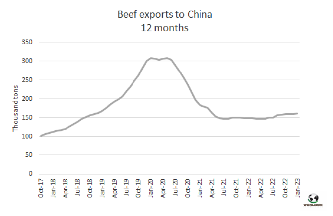 根據(jù)出口國的部分數(shù)據(jù)估計,中國牛肉市場的主要供應(yīng)國1月份對中國出口量約為18.5萬噸。這是自1 2022年1月以來的最低,比去年8月(25.2萬噸)減少了約6.6萬噸。南方共同市場國家出口了約14.9萬噸(阿根廷的數(shù)據(jù)為預(yù)估數(shù)據(jù)),而澳洲國家則向中國出口了2.6萬噸。去年12月,美國向中國出口不到1.1萬噸,預(yù)計1月份這一出口量不會大幅增長。