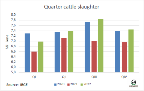 2022年巴西牛屠宰量2970萬頭,比2021年的2770萬頭增長了近200萬頭(+7.1%),而2021年是當前牛周期的生產(chǎn)下限。全年牛肉產(chǎn)量增長了6.5%,達794萬噸。這是自2019年以來的最大產(chǎn)量。