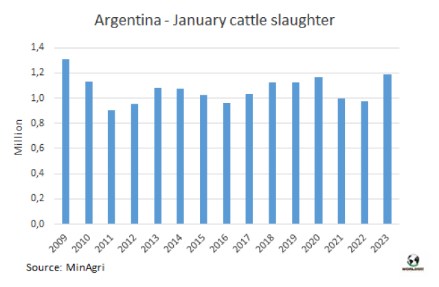 官方數(shù)據(jù)表明,阿根廷1月牛屠宰量1185257頭,同比增加了21.1萬頭,增幅22%。是2009年至今14年以來最高。屠宰量增長最大的種類是母牛,同比增長了46%至19.7萬頭,主要與阿根廷大部分地區(qū)干旱和來自中國的需求增加有關(guān)。屠宰量最大的工廠是Swift(13廠),屠宰量35146頭,其次是Gorina(2025廠),屠宰量27012頭,Arebeef(2082廠),屠宰量26577頭。