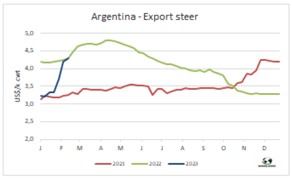 2023年開年至今希爾頓配額內(nèi)冰鮮牛肉價格保持爆發(fā)式增長節(jié)奏。上周阿根廷臀腰肉參考價15500-16200美元/噸,烏拉圭產(chǎn)品參考價14000美元/噸,一些進口商擔心新冠疫情給市場帶來不確定性,本周初還價低于10000美元/噸,烏拉圭Marfrig的CEO上周表示歐洲市場表現(xiàn)出更強的活力,需求比幾個月之前更好了。