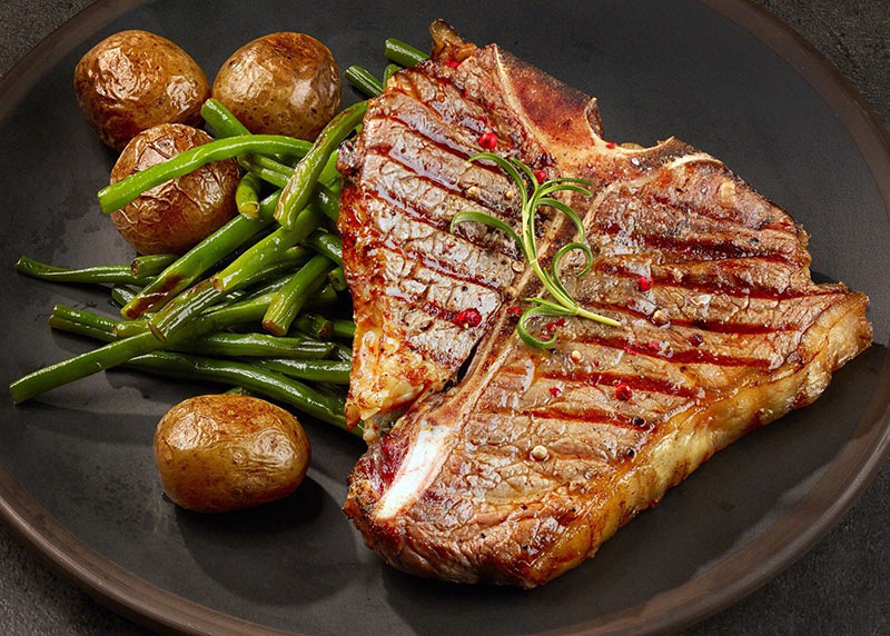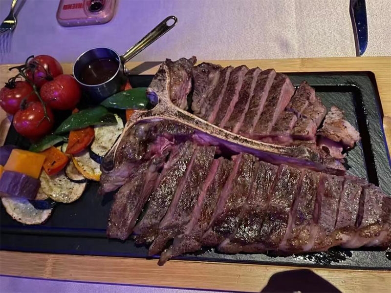 T骨牛排(T-bone steak)位于牛的上腰部,是由西冷、菲力、脊骨構(gòu)成的大塊牛排。常說的“一份牛排兩種風(fēng)味”就是它了。