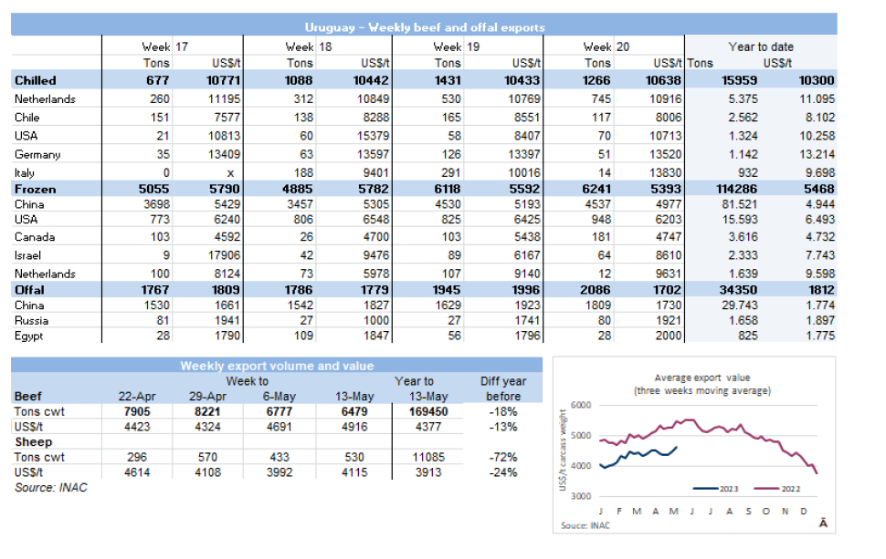 在2023年前四個(gè)月,牛肉出口總量為21萬(wàn)噸(產(chǎn)品重量),價(jià)值接近8.95億美元,這一數(shù)字意味著數(shù)量上同比增長(zhǎng)13.4%,同時(shí)貨值下降17.3%,中國(guó)占了發(fā)貨量的77.4%。去年(從2022年5月至2023年4月),肉類出口總量為65.8萬(wàn)噸產(chǎn)品重量(相當(dāng)于938,500噸帶骨牛肉),價(jià)值接近32.73億美元。