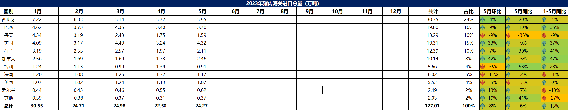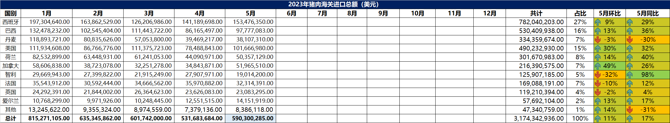 2023年5月冷凍豬肉進(jìn)口數(shù)據(jù)