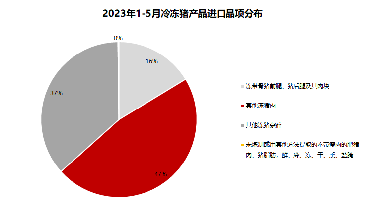 從進(jìn)口品項(xiàng)看,5月豬肉進(jìn)口主要品項(xiàng)分別是其他凍豬肉和其他凍豬雜碎,進(jìn)口量之和占比超過85%。