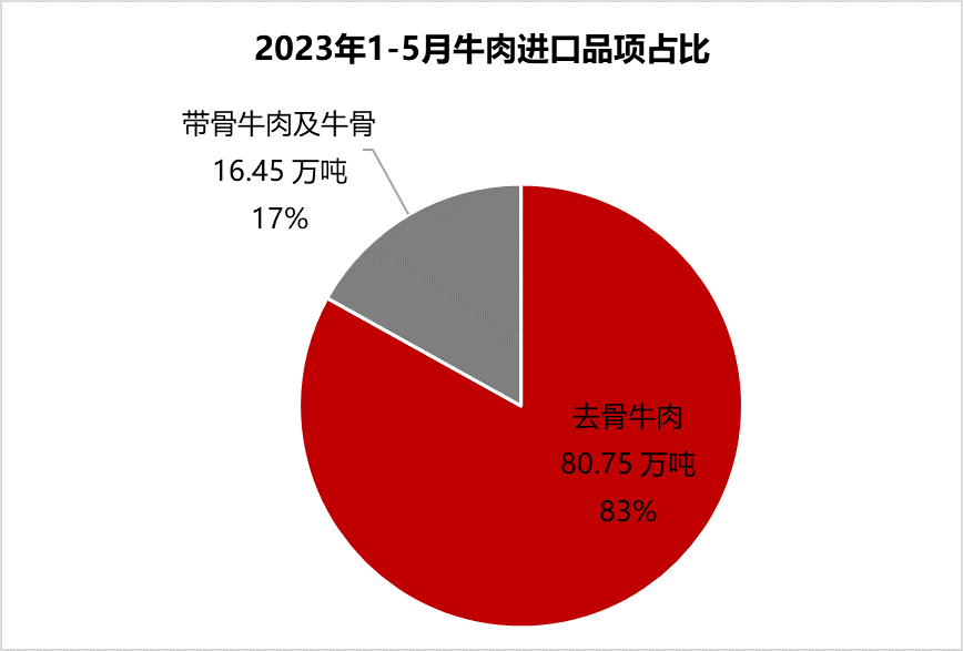 從進(jìn)口品項(xiàng)看,去骨牛肉進(jìn)口量80.75萬噸,占比83%,帶骨牛肉及牛骨進(jìn)口量16.45萬噸,占比17%。