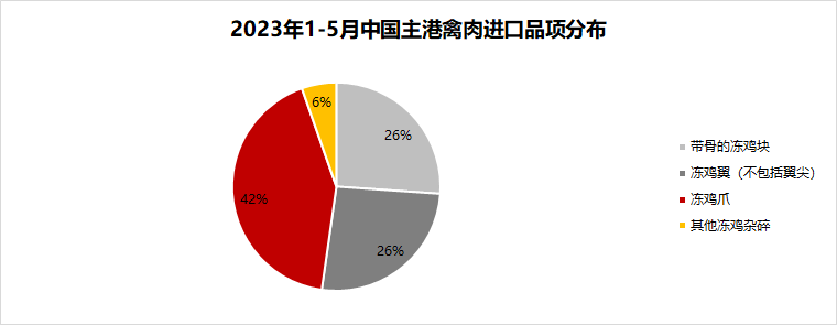 從進(jìn)口品項(xiàng)看,凍雞爪、帶骨的凍雞塊、凍雞翼(不包括翼尖)為主要進(jìn)口品類。其中1-5月凍雞爪進(jìn)口量23.8萬噸,凍雞翼(不包括翼尖)進(jìn)口量14.70萬噸,帶骨的凍雞塊進(jìn)口量14.66萬噸,其他凍雞雜碎進(jìn)口量3.02萬噸。