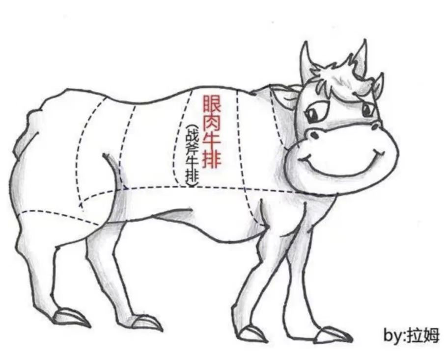 眼肉,也叫肋眼,英文是Rib Eye或Cube Roll,是整頭牛身上最經(jīng)典的牛排部位,也是判斷整頭牛雪花紋理等級的標(biāo)桿部位,屬于高檔肉,是一等類肉的代表。它位于牛的肩部,牛背上兩側(cè)前面,牛脊背第七根至第十根肋骨之間,牛上腦肉與牛外脊肉之間的那塊肉。牛眼肉外形酷似眼睛,因而得名。
