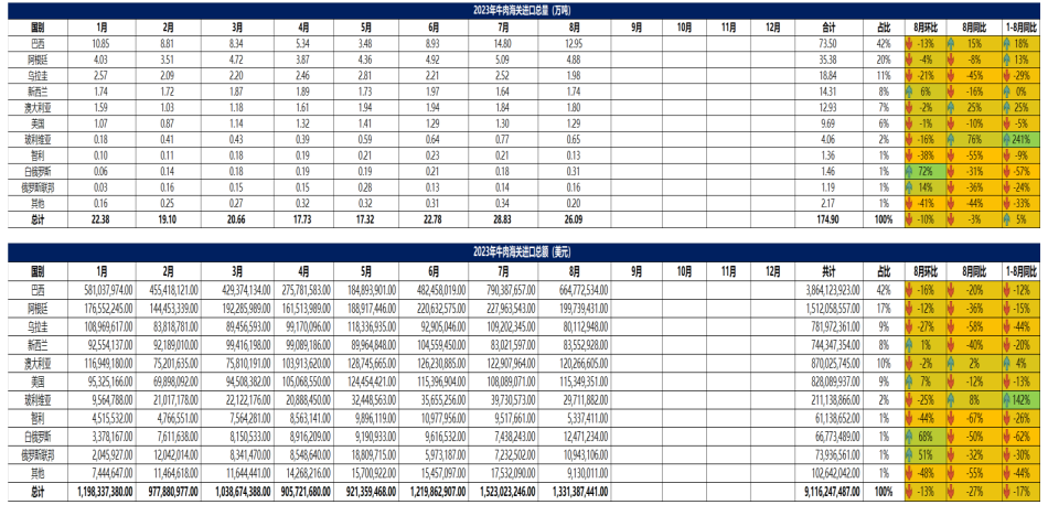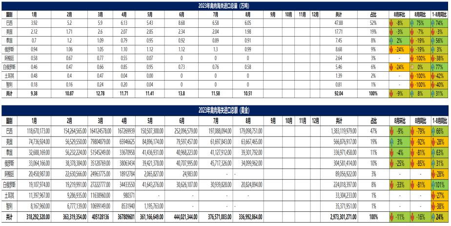 2023 年 8 月中國主港牛肉進口量 26.09 萬噸,環(huán)比減少 10%,同比減少 3%。1-8 月, 中國主港牛肉進口總量 174.90 萬噸,同比增加 5%。從進口國別看,進口巴西牛肉 73.50 萬 噸,同比增加 18%,占比 42%。進口阿根廷牛肉 35.38 萬噸,同比增加 13%,占比 20%。進口烏拉圭牛肉 18.84 萬噸,同比減少 29%,占比 11%。進口新西蘭牛肉 14.31 萬噸,與去 年同期持平,占比 8%。進口澳大利亞牛肉 12.93 萬噸,同比增加 25%,占比 7%。從進口品 項看,凍去骨牛肉進口總量 146.75 萬噸,占比 84%。凍帶骨牛肉進口總量 28.14 萬噸,占比 16%。從進口金額看,1-8 月,中國主港牛肉進口金額共計 91.16 億美金,同比減少 17%。其中,巴西牛肉進口金額 38.64 億美金,同比減少 20%。阿根廷牛肉進口金額 15.12 億美金, 同比減少 36%。澳大利亞牛肉進口金額 8.70 億美金,同比增加 2%。烏拉圭牛肉進口金額 7.81 億美金,同比減少 58%。新西蘭牛肉進口金額 7.44 億美金,同比減少 40%。