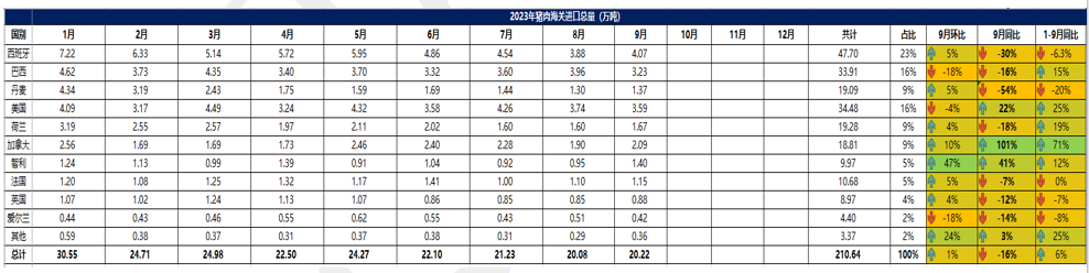 2023 9月中國主港豬肉進口量 20.22 萬噸,環(huán)比上漲1%,同比減少 16%。1-9 月主 港豬肉進口量 210.64 萬噸,同比增加 6%。從進口國別看,其中,從西班牙進口豬肉共計 47.7 萬噸,同比減少 6.3%,占比 23%。從美國進口豬肉共計 34.48 萬噸,同比增加 25%,占比 16%。從巴西進口豬肉共計33.91 萬噸,同比增加 15%,占比 16%。從丹麥進口豬肉共計 19.09萬噸,同比減少20%。從進口品項看,1-9月,凍帶骨豬前腿、豬后腿及其肉塊進口量 30.95萬噸,占比 15%。其他凍豬肉進口量95.72萬噸,占比 45%。其他凍豬雜碎 83.44 萬噸,占比 40%。豬油脂類進口量僅 0.49 萬噸。從 進口金額看,1-9 月,主港豬肉進口總額 50.95 億美金,同比上漲 15%。其中,進口西班牙 豬肉金額 12.02 億美金,同比持平。進口巴西豬肉金額 8.88億美金,同比上漲 33%。進口美國豬肉金額 8.27 億美金,同比上漲 22%。進口丹麥豬肉金額 4.65億美金,同比減少6%。