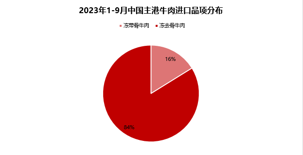 2023 9 月中國主港牛肉進口量 24.02萬噸,環(huán)比減少 8%,同比減少 1%。1-9 月, 中國主港牛肉進口總量 198.92 萬噸,同比增加 5%。從進口國別看,進口巴西牛肉 84.32 萬 噸,同比增加 15%,占比 42%。進口阿根廷牛肉40.49萬噸,同比增加 13%,占比 20%。 進口烏拉圭牛肉 20.78萬噸,同比減少 28%,占比 10%。進口新西蘭牛肉 15.91萬噸,同比下降2%,占比 8%。進口澳大利亞牛肉 14.66 萬噸,同比增加 26%,占比 7%。從進口品 項看,凍去骨牛肉進口總量 166.73 萬噸,占比 84%。凍帶骨牛肉進口總量 32.18萬噸,占比 16%。從進口金額看,1-9 月,中國主港牛肉進口金額共計 102.67億美金,同比減少 18%。 其中,巴西牛肉進口金額 43.77 億美金,同比減少 15%。阿根廷牛肉進口金額 17.09億美金, 同比減少 16%。澳大利亞牛肉進口金額9.89億美金,同比增加 6%。烏拉圭牛肉進口金額 8.51 億美金,同比減少 44%。新西蘭牛肉進口金額8.21億美金,同比減少23%。